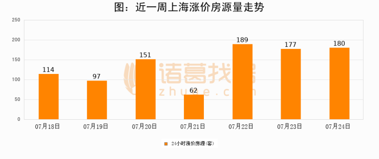 根据诸葛找房数据显示,上海24小时涨价房源量为180套,较07月23日增加3套,环比上涨1.7%。与此同时,涨价房源占比小幅扩大,业主信心有所提升。