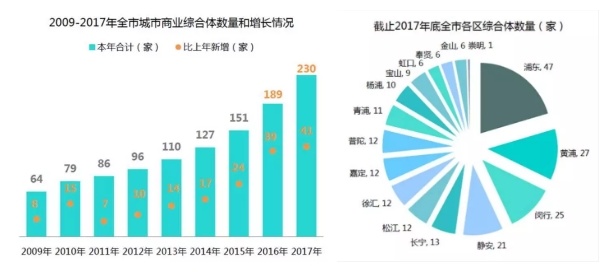 随着城市的升级与发展,商业综合体作为集购物、休闲、娱乐为一体的“城中之城”应运而生。根据上海市商务发展研究中心的统计,截止2017年底,上海共有230家城市商业综合体。从数量上看,商业综合体数量逐年增长;从区域来看,浦东新区的商业综合体数量遥遥先进,黄浦和闵行分别位列第二和第三。同时,由于中心城区商业体量逐渐饱和,商业综合体也呈现出向外围延伸的趋势。