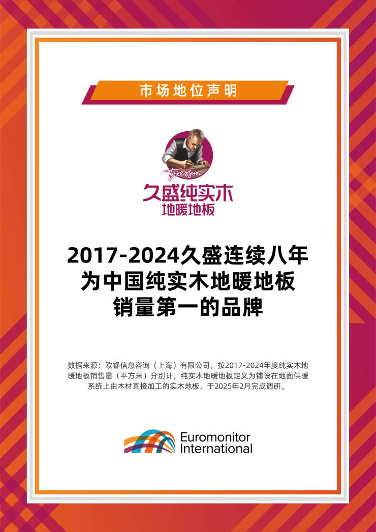 久盛纯实木地暖地板以卓越的技术、优质的原材、实在的价格,赢得了广大消费者的赞誉与信赖,连续八年稳居销量冠军宝座!这不仅是久盛品牌实力的卓越展现,更是其作为行业标杆的责任与担当。做健康、高品质的产品是久盛的使命,选择久盛纯实木地暖地板,就是选择品质与健康,选择安心与舒适!