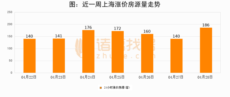 根据诸葛找房数据显示,上海24小时涨价房源量为186套,较04月27日增加46套,环比上涨32.9%。与此同时,涨价房源占比小幅扩大,业主信心有所提升。