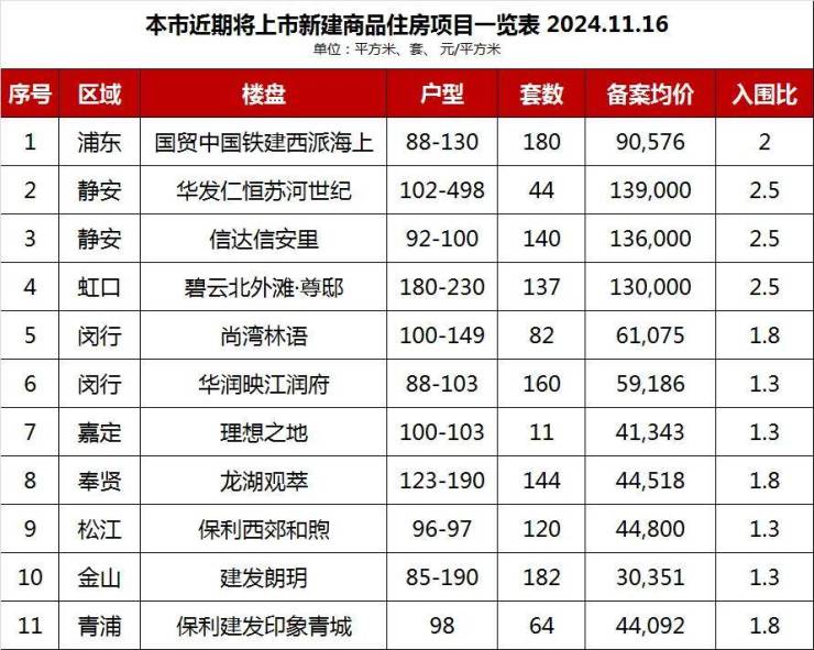 11月16日,网上房地产公示了11个即将入市的新盘!其中10w+豪宅项目仅3个,9w+项目1个,其余项目备案价格在3-6.1万区间。名单明细如下: