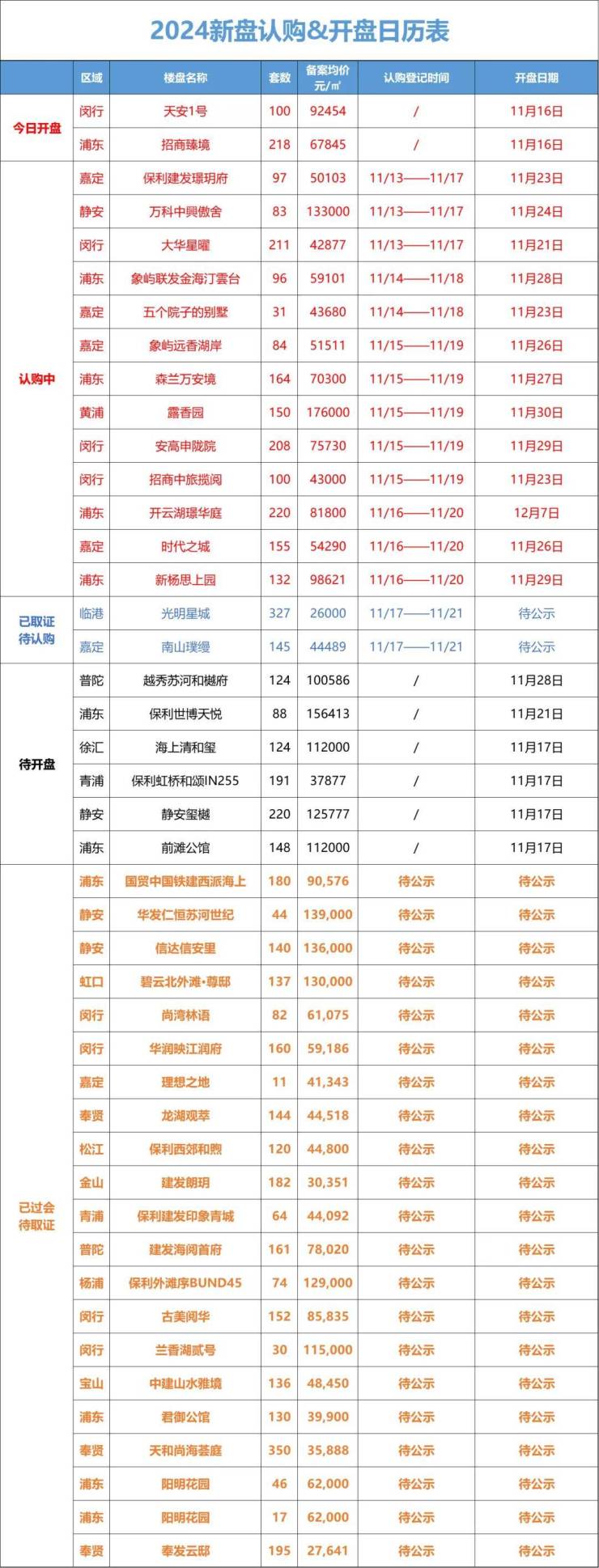 11月15日,中海领邸玖章开盘售罄、招商时代潮派开盘去化约51%、张江金茂府开盘去化约92%;天安1号、招商臻境今日开盘。
