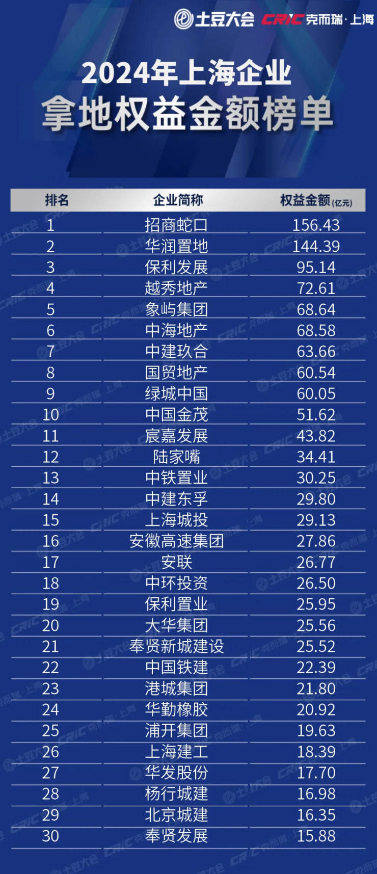 据统计,上海2024年共成交商住办用地81宗,成交建面609万㎡,总金额达到1534亿元,成交总建面同比下滑36%,成交总金额同比下滑32%。各企业斩获情况详见下图: