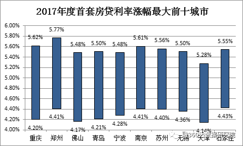 融360监测数据显示:2017年度首套房贷利率上涨幅度较大前十城市为,重庆1.42个百分点;郑州1.36个百分点;佛山1.32个百分点;青岛1.29个百分点;宁波1.21个百分点;南京1.20个百分点;苏州1.16个百分点;无锡1.15个百分点;天津个1.14个百分点;石家庄1.12个百分点。