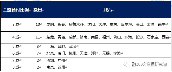 2017年12月二套房主流首付3成的城市数有10个,占比28.57%,分别为昆明、长春、乌鲁木齐、沈阳、大连、重庆、哈尔滨、海口、太原、南宁;首付4成的城市数为11个,占比31.43%,分别为东莞、石家庄、青岛、成都、济南、南昌、福州、佛山、珠海、长沙、西安。二套首付情况总体稳定,未出现大幅变化。