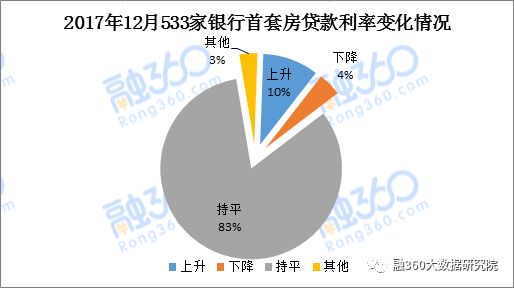 融360监测数据显示,2017年12月在全国35个城市533家银行中,有53家银行首套房贷款利率上升,占比9.94%;有22家银行首套房贷款利率下降,占比4.13%;有441家银行首套房贷款利率与上月持平,占比82.74%。本月共有47家银行分(支)行暂停受理首套房贷业务,较上月减少9家银行分(支)行。