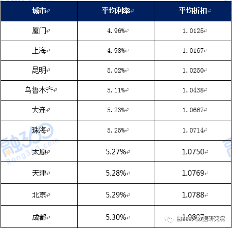 2017年12月全国首套房平均利率较低的城市前十分别为厦门4.96%、上海4.98%、昆明5.02%、乌鲁木齐5.11%、大连5.23%、珠海5.25%、太原5.27%、天津5.28%、北京5.29%、成都5.30%。
