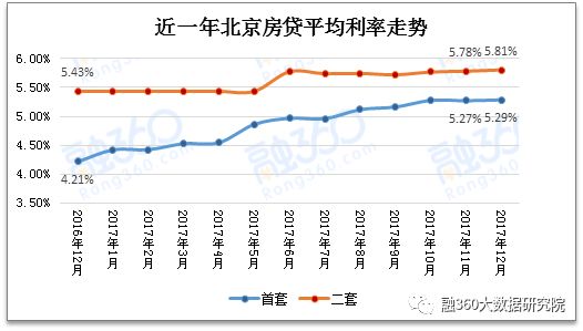 融360监测数据显示,2017年12月北京首套房贷款平均利率为5.29%,较11月监测数据(首套房平均利率5.27%),整体利率水平上浮0.02个百分点,二套房贷款平均利率为5.81%,较11月监测数据(二套房平均利率5.78%),整体利率水平上浮0.03个百分点。