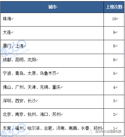 表3-1:2017年度月平均利率较低前十城市上榜次数
