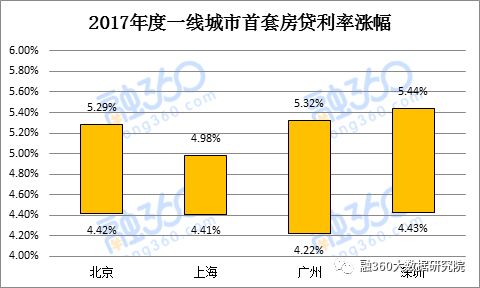 2017年度一线城市首套平均利率中,广州上涨1.10个百分点;深圳上涨1.01个百分点;北京上涨0.87个百分点;上海上涨0.57个百分点。