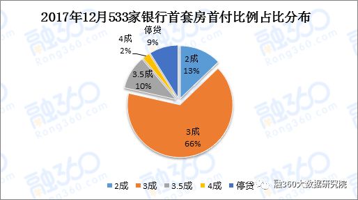 2017年12月,全国533家银行中首套首付2成的有68家银行,占比12.76%,较上月减少8家; 首付3成的有349家银行,占比达65.48%,较上月增加18家;首付3.5成的银行有55家,占比10.32%。
