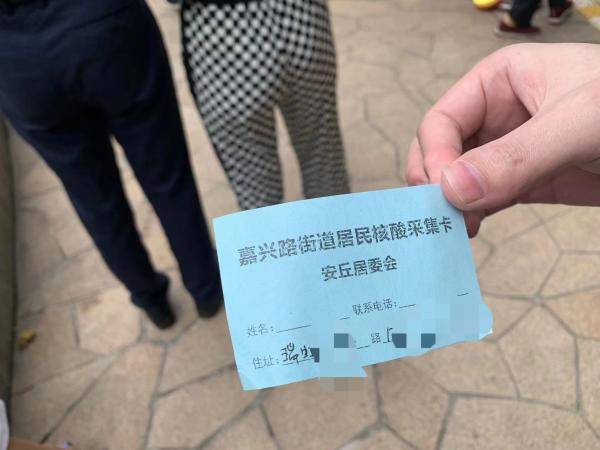 此外,记者发现不少居民手持一张淡蓝色核酸采集卡,上面写有“嘉兴路街道居民核酸采集卡安丘居委会”字样,同时写有居民的住址户号,采集点工作人员告诉记者,采集卡是用于分辨排队人员是否为街道居民,但他们也发现不少居民根本没有拿到采集卡,工作人员也会建议居民向居委会申领。“嘉兴路街道居民核酸采集卡安丘居委会”核酸采集卡。 澎湃新闻记者 朱奕奕
