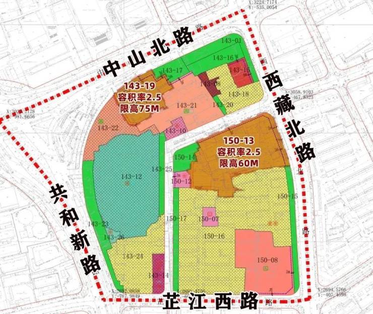 150-13地块东至西藏北路、南至保留住宅用地、西至规划公共绿地社区公服用地、北至规划道路;143-19地块东至规划公共绿地、南至规划教育用地、西至教育用地、北至中山北路。