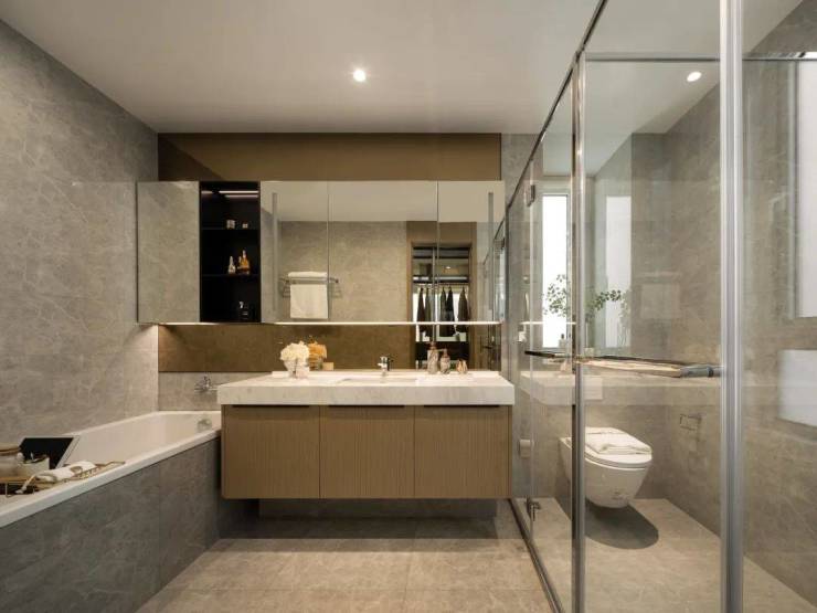 四房两厅三卫,建面约147-157㎡精装叠墅,分上中下叠,下叠配备层高约5.5米的地下室,上叠的南北侧配有露台。项目叠墅同样是精装交付,采用国际知名品牌,日立的中央空调、威能的地暖两大件配齐,还采用了杜拉维特、汉斯格雅洁具龙头,西门子的油烟机、灶台、消毒柜和蒸烤一体机等。