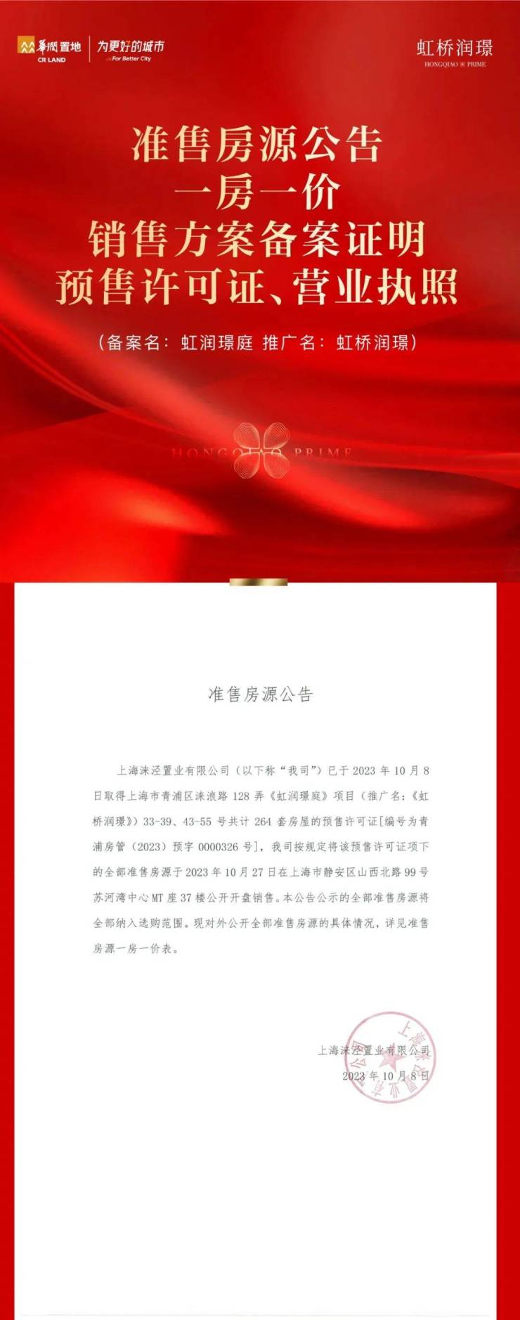 华润虹桥润璟推出264套,户型建面约79-199平房源,均价约71372元/㎡,开盘时间是10月27日。项目入围比为1.8,社保系数为0.15。