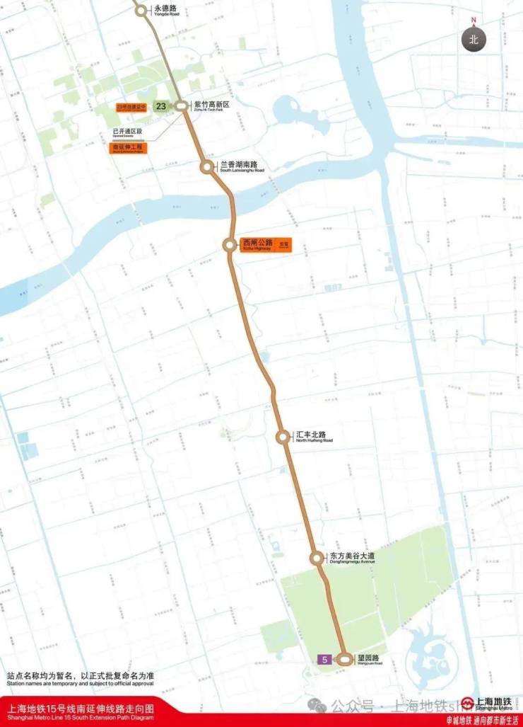 该线路自现有的13号线金运路站出发向西延伸,终点设在青浦徐泾的诸光路,共设车站5座,全长约9.6公里。