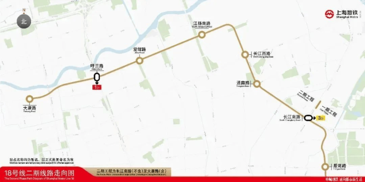 目前,6座车站主体全部封顶。车站也依次定名为:通南路站、长江西路站、江杨南路站、爱辉路站、呼兰路站、康文路站。预计将在2025年1月开始站台门供应,并于2025年12月31日进入初期运营。
