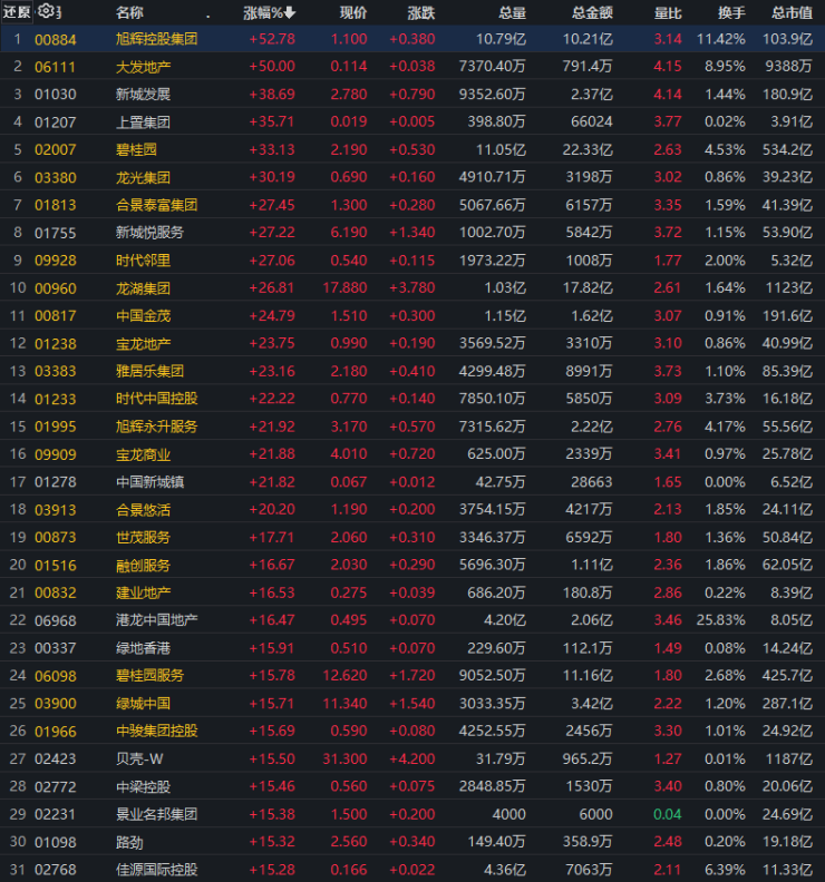 港股内房股中,旭辉控股、大发地产涨幅均超过50%,新城发展、碧桂园、龙光集团等股票涨幅超过30%,合景泰富、龙湖集团、中国金茂、宝龙地产、雅居乐集团、时代中国等股票涨幅超过20%。