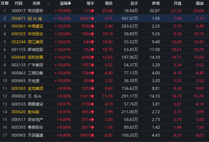 具体来看,A股保利发展、万科A、阳光城、金科股份、滨江集团、绿地控股、华发股份、新城控股、金地集团、中南建设等多支头部地产股涨停。