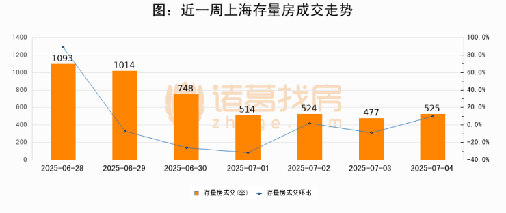 从存量房来看,2025年07月04日上海存量房单日成交525套,比昨日增加48套,环比上涨10.1%。从近一周存量房成交来看,上海存量房日均成交套数为699套,07月04日单日成交525套,低于近一周平均水平24.9%。