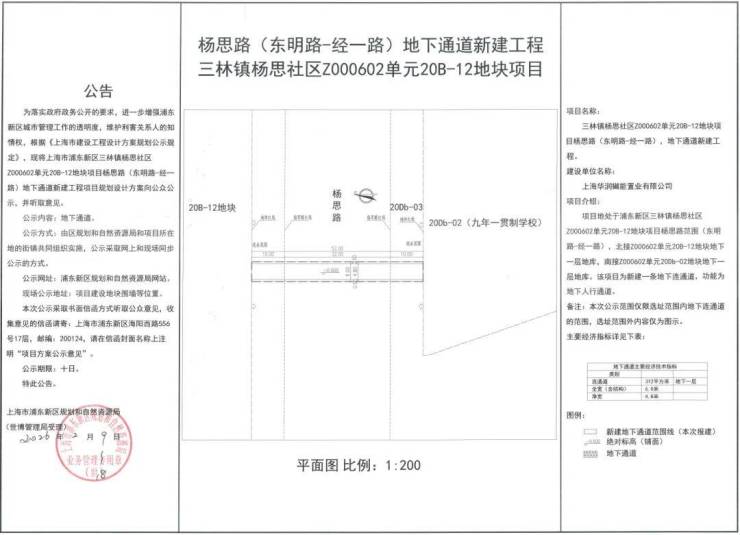 另据官网消息,杨思社区Z000602单元20B-12地块项目杨思路(东明路-经一路)地下通道新建工程项目方案已公示,连通住宅地块及新的九年一贯制学校,建设单位为上海华润樾能置业有限公司(华润+越秀+中能建)。未来建成后,从新的住宅地块往返学校会更便捷安全。