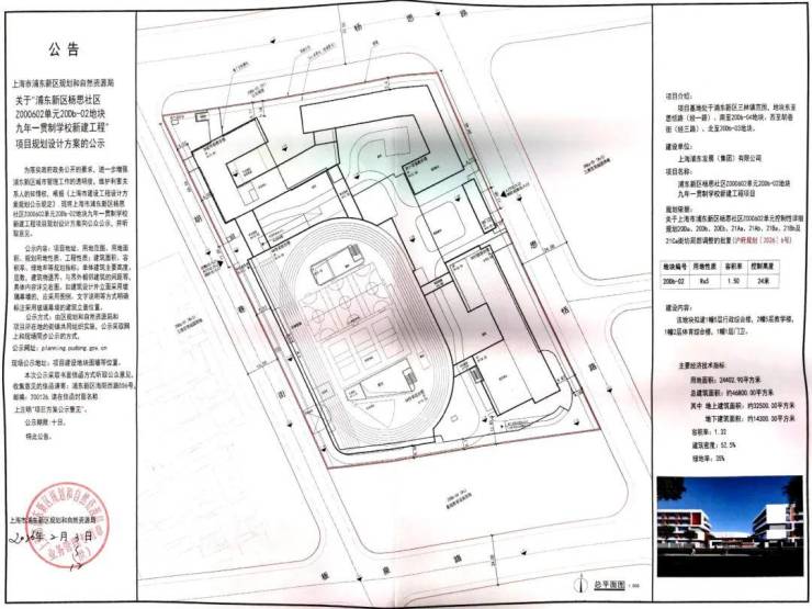近日,浦东新区杨思社区Z000602单元20Db-02地块九年一贯制学校新建工程项目规划设计方案正式在官网公示。