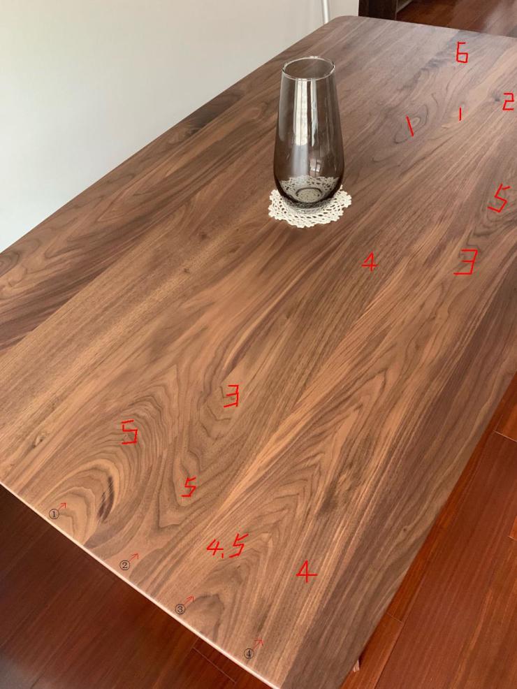 从产品图片看,四块板子中,大面积的大山纹交错应用,顺畅的直线纹夹着少许的波浪纹。水滴纹,鸟啄纹也在强行刷着存在感,板①尾处难得一见的金瘤纹,它的存在明明白白的告诉您,这就是黑胡桃家具,而且品相上乘。
