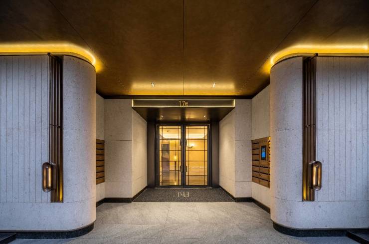 入户大堂内严选太古黑石材及绿野仙踪石材拼嵌,通过水刀石材拼花工艺,营造出从都市精致到松弛度假的情绪过渡。单元入户门头的鎏金门厅设计,手工艺术灯具、海派全自动单元门、人脸识别系统等细节运用,成为新精致青年鲜明的品味标签,引领奢雅新派的都会生活方式。