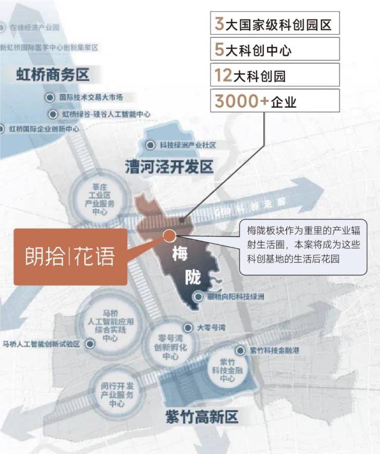 项目周边有3大国家级产业区、5大科创中心、12大科创园、3000+企业,直线距离约7公里范围内拥有漕河泾开发区、紫竹高新技术产业园等科创基地,西侧直线距离约190m即是梅陇镇政府,东侧就是梅陇新中心。据悉,漕河泾开发区有望入住梅陇,为增强闵行中部地区科技创新活力。