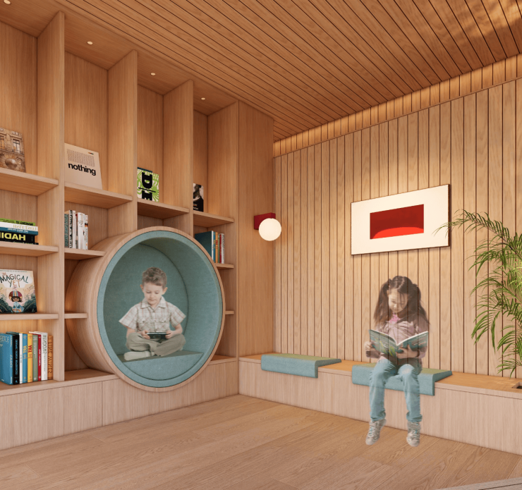沉浸式书吧就是业主的第二客厅,和亲子区动静分离。在这里,可以给业主一个舒适安静空间,在优雅的环境中享受独处,阅览着自己心仪的图书。同时,也设置有整面包含上海属地人文书籍,世界城市地理等书籍的书墙和24小时自动贩卖机,咖啡机,让业主足不出户就能享受书香气息的便捷生活。