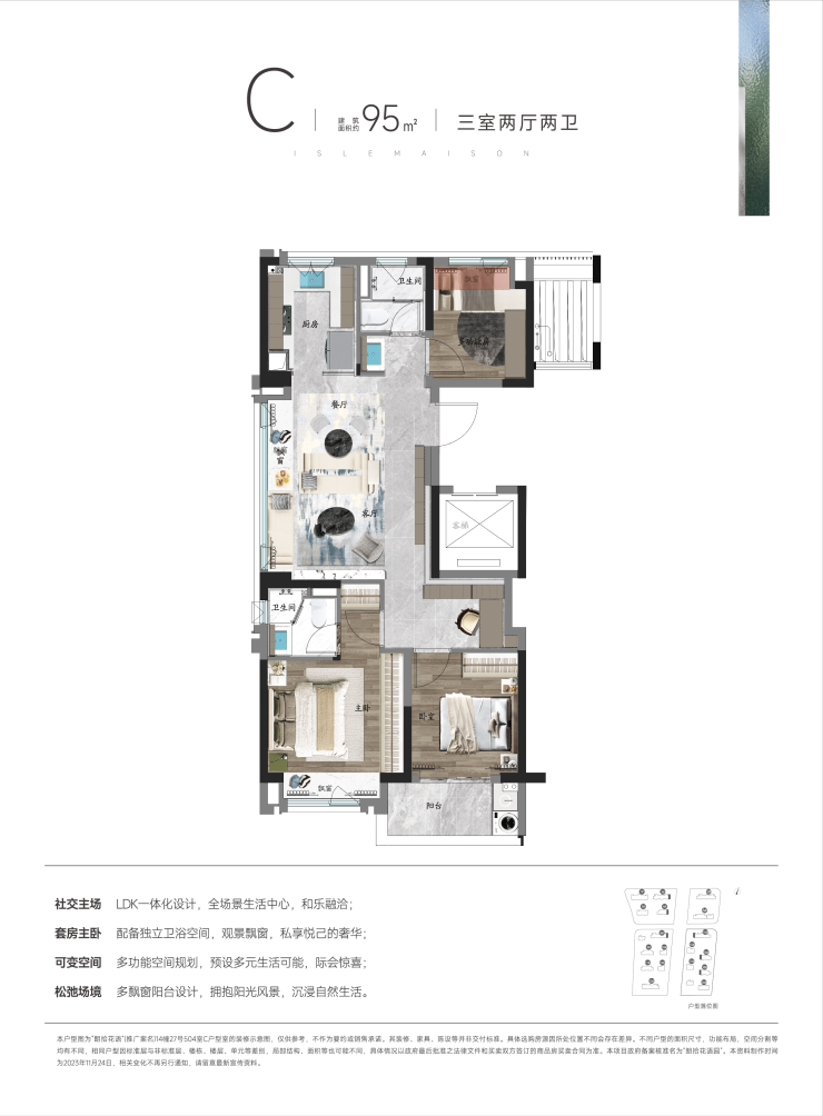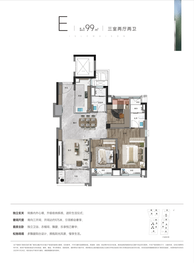 边套均为建面约99㎡户型(本批次售完绝版),仅有36套。9#楼位于6-3核心组团地块,环绕着静心庭院、Mini植物园、微风草坪和水榭林间等景观。也是所在地块主入口的第一幢楼,步行归家更加便捷。