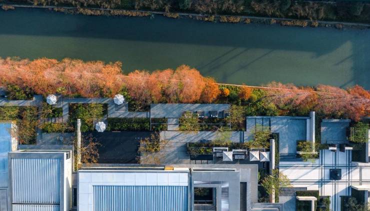 朗拾花语为居者创建了这样一幅舒缓惬意的水岸悦然图景,春申塘、西马屯泾两大天然水系环绕,社区外营造了滨水活力轴和烟火生活轴的十字生态,让整个社区宛若一座水上的自然岛屿。