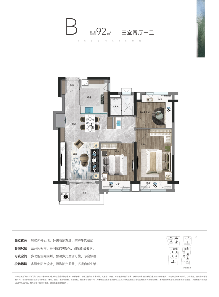 其中,建面约92㎡户型整体方正,三开间朝南,消灭了过道,餐厅空间可加餐边柜。这款户型最大的特点在于灵动可变。一系列细节背后,是朗拾花语对于生活舒适感更细的观察,处处为业主带来高品质生活的用心。