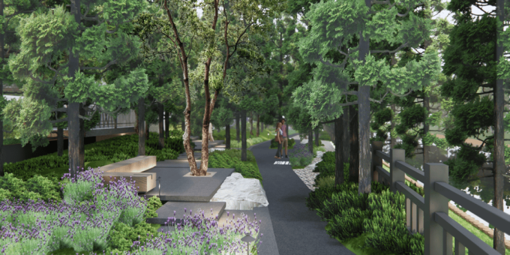 滨水活力轴是通过借景的形式,与水岸内外连通,两岸轴线分布滨水步道,植入了万物友好理念,可以承载散步、遛狗、休闲等户外生活方式。