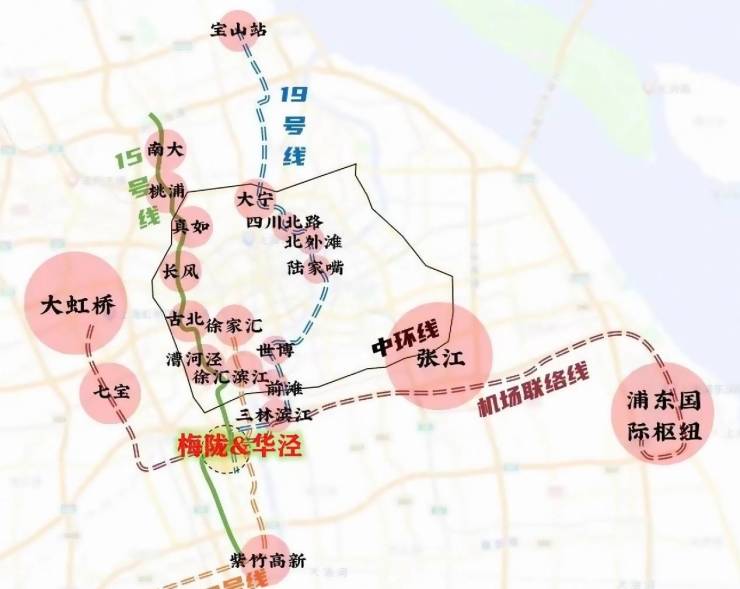 在交通方面,朗拾花语周边15号线(已通车)、19号线(在建中)、机场联络线3轨交汇。其中,项目距15号线虹梅南路站步行仅约400米,一站徐汇;约300米直上虹梅南路高架;19号线换乘直通前滩、上海世博园区;项目南侧银都路越江隧道2024年年底建成后,可直通“浦东金色中环”。