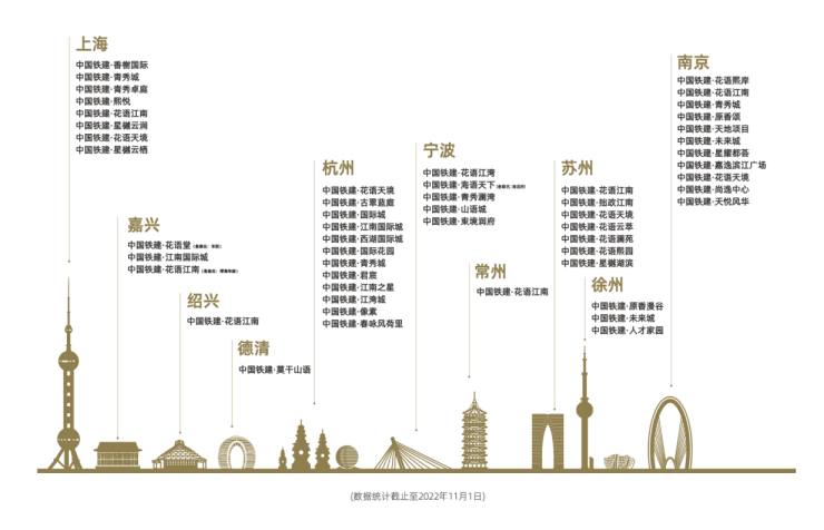 中国铁建地产华东公司贯彻落实集团“一体两翼,多点支撑”的战略部署,深耕房地产住宅开发的主航道,积极践行“品质铁建”谋略,在江苏、浙江、上海两省一市打造了10城51部著作。基于华东独有的江南文化,针对不同的客户群体,打造了更具江南特色美好人居的三大产品系江南系、花语系、星樾系,打造出拙政江南、莫干山语、花语江南、花语堂等众多市场明星楼盘和城市封面作品。2022年,年度销售金额破400亿,实现口碑与业绩的双丰收。
