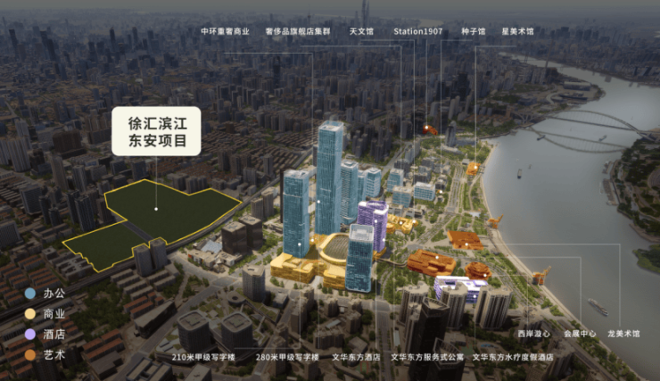 东安项目以约 50 万平方米商住综合体体量,承载高端居住、前沿科研与活力配套功能;西岸金融城凭借180万平方米超级体量,打造国际商务办公集群,中环系列重奢商业,文华东方度假及精品酒店和公寓,以及西岸漩心、种子馆、天文馆等文化艺术地标。二者业态互补、资源互通,将在徐汇滨江形成总规模超230万平方米的城市开发集群。