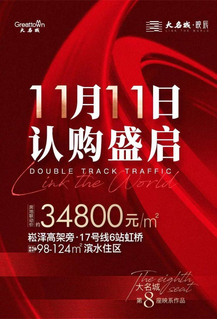 较新消息,大名城映辰已成功获取预售许可证,将于2022年11月11日9:00正式开启认购,34800元/㎡上车大虹桥。