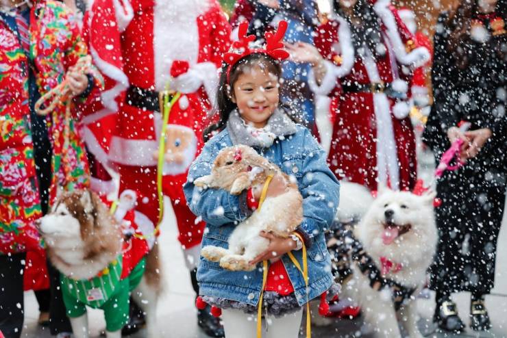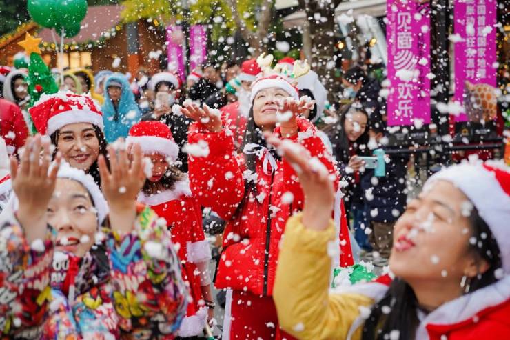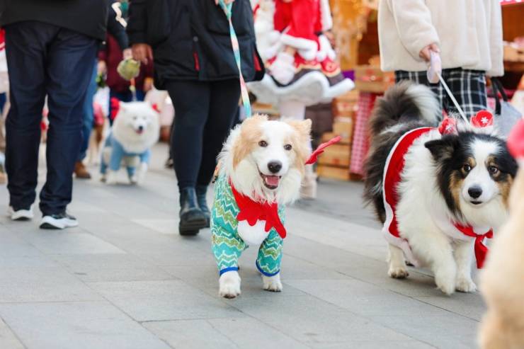 活动期间,许多毛孩子也披上了圣诞装扮,加入巡游队伍,成为街头移动的治愈神器。当现场“上海初雪”降临,120多位参与者在纷飞雪花中互诉圣诞心愿,童话般的冬日场景瞬间成为节日记忆中的高光时刻。