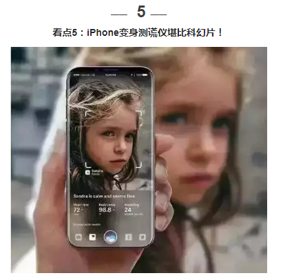 把iPhone 8对准人物进行拍照时,还能显示拍摄到人的心跳、体温、呼吸等状态。万一说谎,这就变成一台测谎仪了,简直堪比科技大片啊!