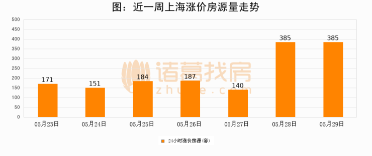 根据诸葛找房数据显示,上海24小时涨价房源量为385套,较05月28日持平。