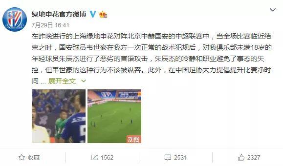 此外,国安方面也表示,俱乐部已对韦世豪在被犯规的情况下向对手爆粗口的不冷静举动进行了批评教育,要求他即使受到了对手的侵犯也要保持冷静,时刻约束自己的言行。