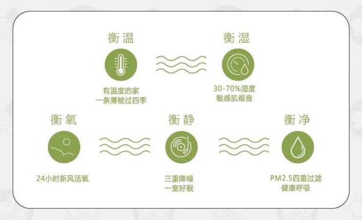 根据城市地理环境、气候条件等因素,搭建五衡空间生活场景,以衡温、衡湿、衡氧、衡静、衡净的健康人居科技,为每个重要日常赋能。