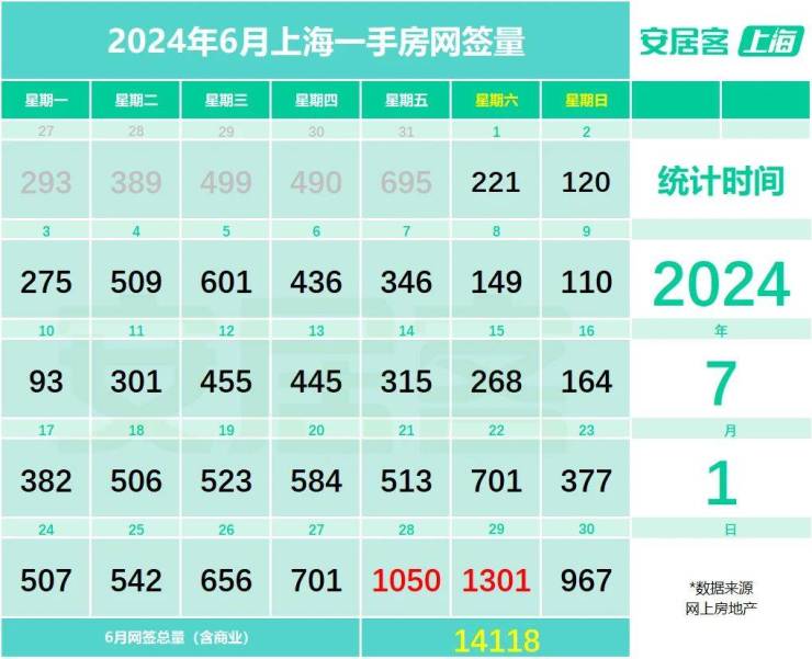 据安居客监测数据,6月上海一手房共计网签14118套,环比上涨约16.71%。其中,6月下半月开始新房市场成交量持续上升,尤其是6月底的新房市场表现出色,连续两日成交量都超过了1000套。