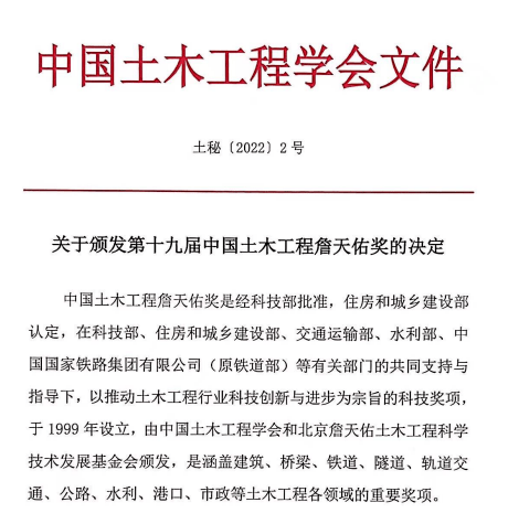 中国土木工程詹天佑奖,是以表彰奖励科技创新与新技术应用成绩显著的土木工程建设项目为宗旨的科技奖励项目,由中国土木工程学会和北京詹天佑土木工程科学技术发展基金会于1999年联合设立,是中国土木工程领域工程建设项目科技创新的最高荣誉。