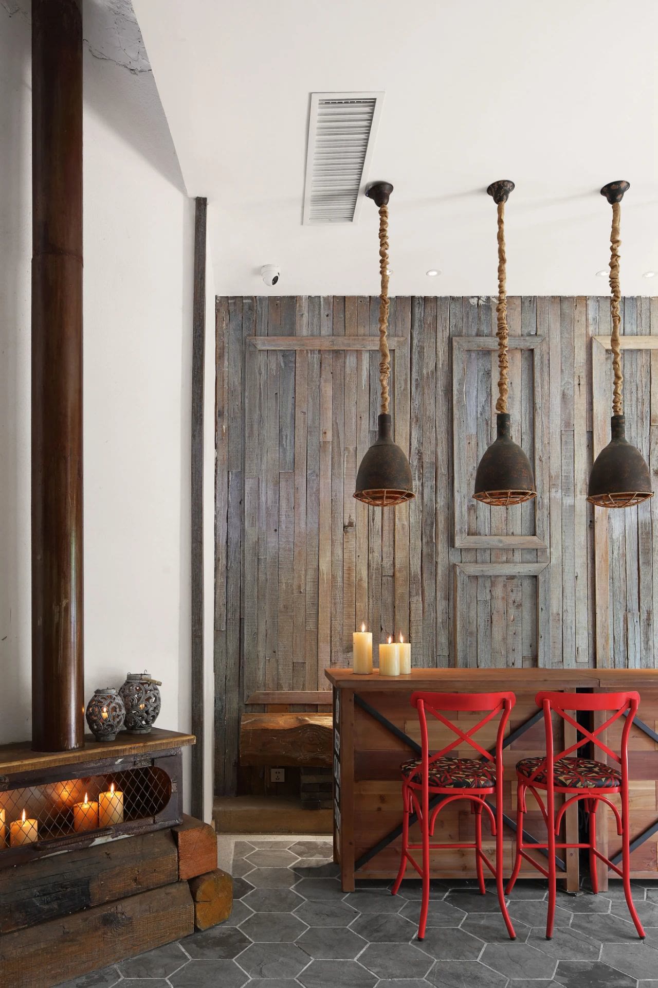 《小漫餐厅》的硬装设计没有高贵的材质,没有刻意的表达,空间布局是整体结构的亮点,推开门是一面旧木墙,普通的青砖用六边形展现出不同。特制的吧灯呼吁着质朴柔和的氛围,厚重的楼梯踏板上是粗犷自然的水泥墙。