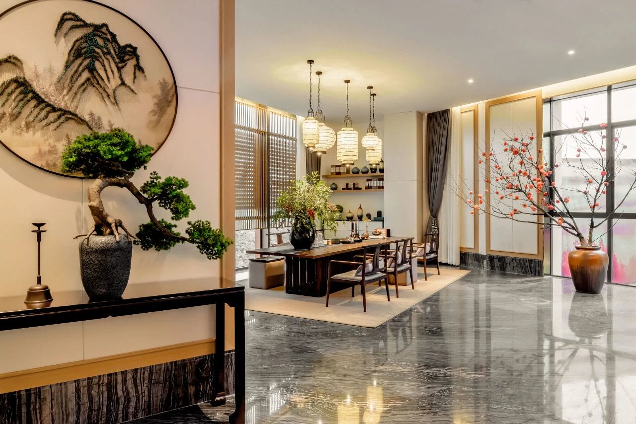 《庐江潜川书院》的灵感来源于对我国中国传统文化的传承,中华民族传统住所中的那种古典韵味美,最终决定了新中式风格的传统加现代结合设计而成,以现代的装饰手法和家具结合古典中式的装饰元素,迎客松,纸墨笔砚等都体现了浓郁的东方之美。