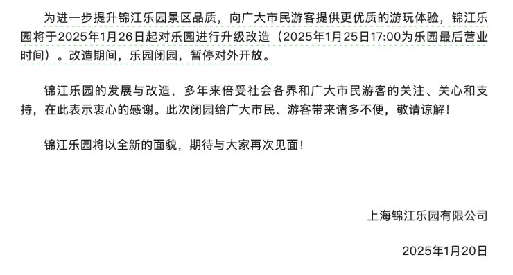 上海锦江乐园1月26日起闭园改造,预计2027年重新开放