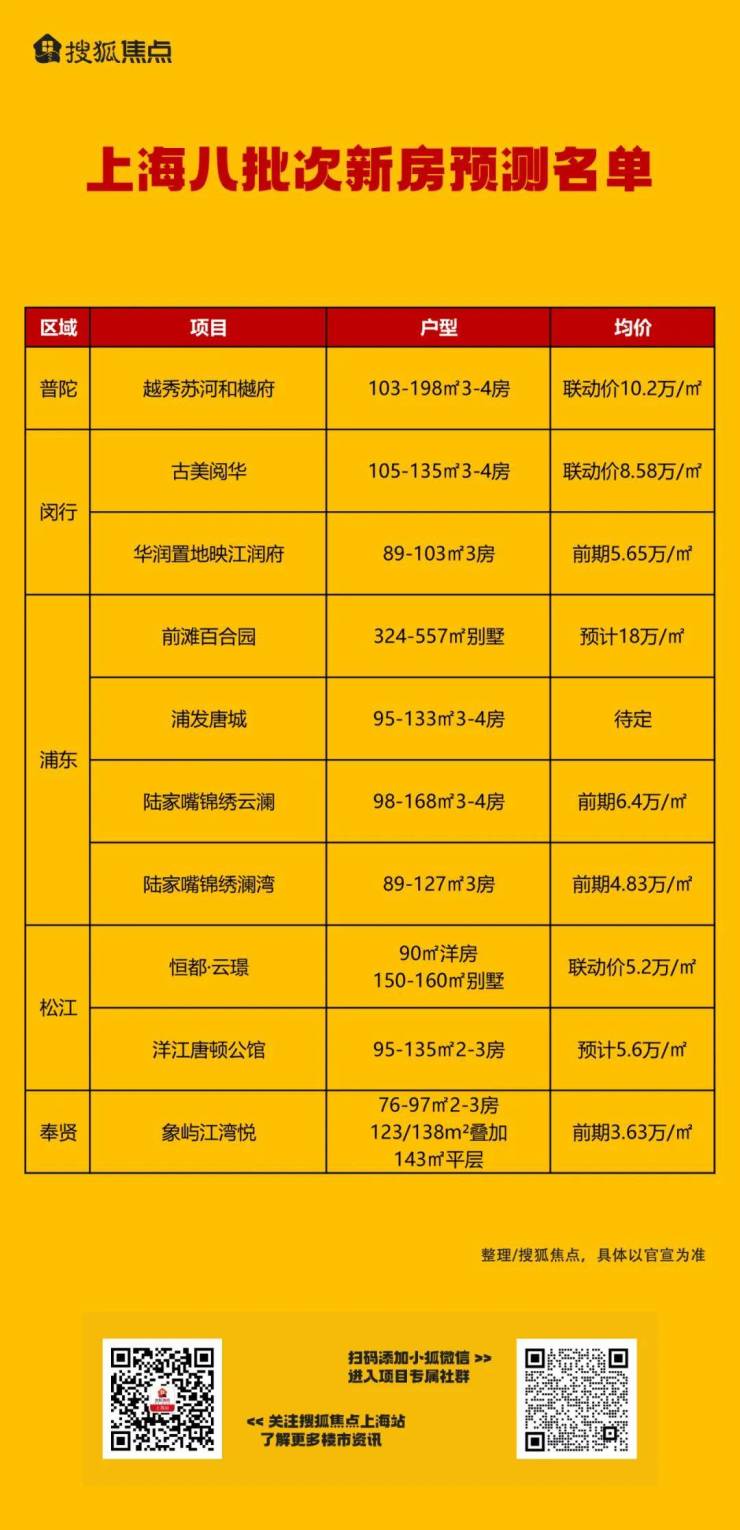 网传八批次新房或将于本月底上会,最新名单如下:越秀苏河和樾府、古美阅华、浦发唐城、陆家嘴锦绣云澜、洋江唐顿公馆等盘预备入市!
