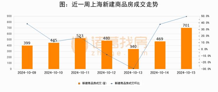 根据上海市房地产交易中心数据显示,2024年10月15日上海新建商品房成交701套,较昨日增加232套,环比上涨49.5%